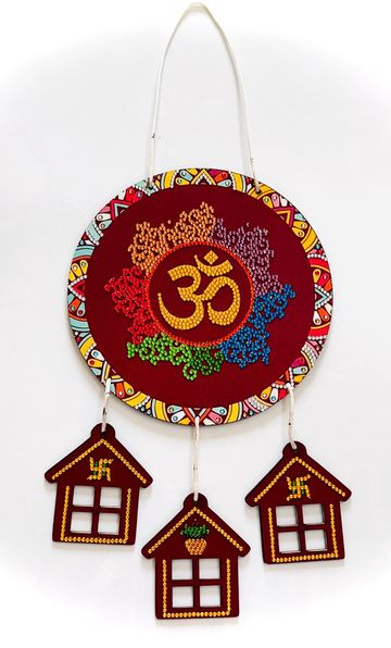 Three miniature house-shaped hangings at the bottom feature auspicious symbols like the swastik and kalash, adding to the spiritual significance.