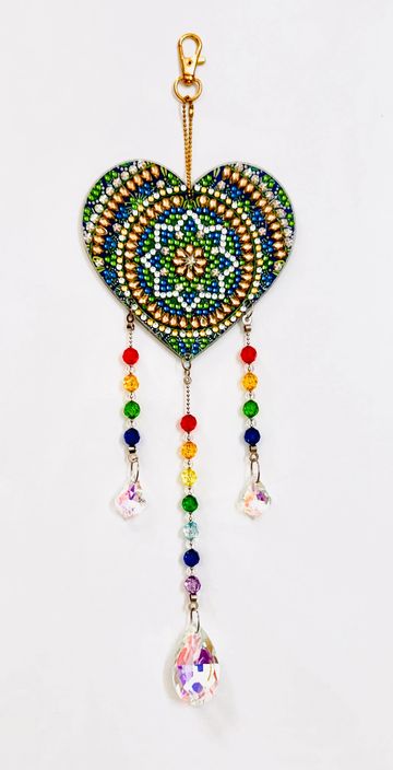 Hand-crafted with precision, this dazzling heart-shaped charm is adorned with intricate diamond beadwork in rich hues of emerald green, sapphire blue & golden accents filling warmth, love & positive energy into your space.