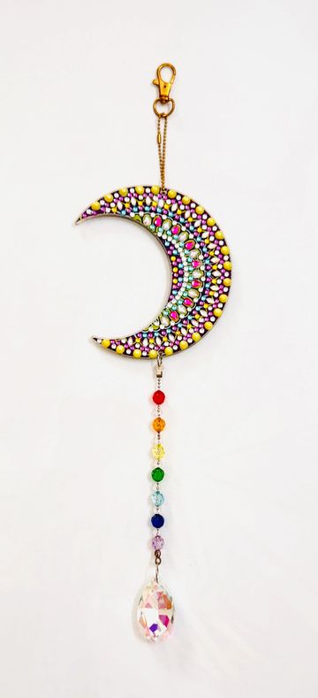 For the dreamers and stargazers, this celestial art piece is adorned with intricate rhinestones in hues of gold, violet, pink & turquoise, creating a celestial shimmer that shines beautifully from both sides.