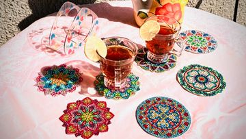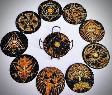 Let your tablescape shimmer with themed coasters crafted like miniature works of art. Every diamond sparkles with intention, every dot pattern sings of a mood — be it mandala, coastal, funny or floral - turning everyday essentials into soulful, shining expressions of beauty!