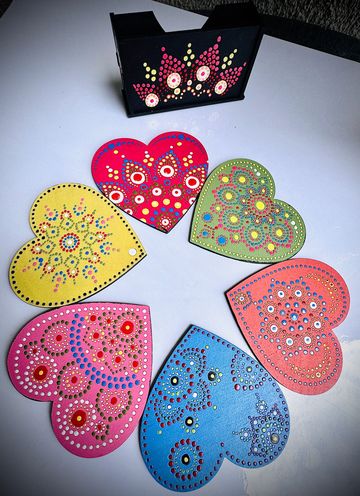 A stunning fusion of functionality and artistic flair - this exquisite set of 6 heart-shaped coasters, each uniquely hand-painted with intricate dot art, is designed to spread a rich tapestry to your coffee table, dining space, or office desk. Whether you’re hosting guests or sipping solo, these coasters bring charm, tradition & a glimmer of glee to every moment.