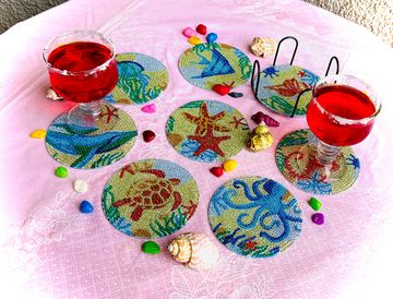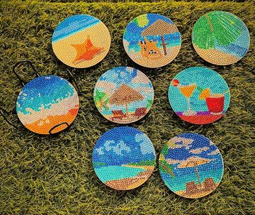 Each coaster sparkles with colorful diamond beads, showcasing seaside scenes like waves, starfish, huts, cocktails & sunsets.